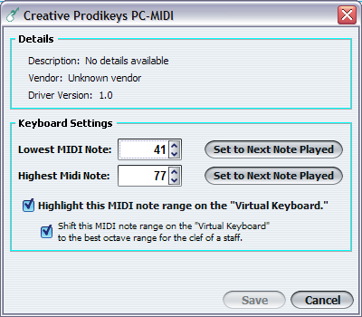 Here you will find a list of the current MIDI output devices installed on your machine that may be used for playback. You may select the one that sounds best to your taste. |