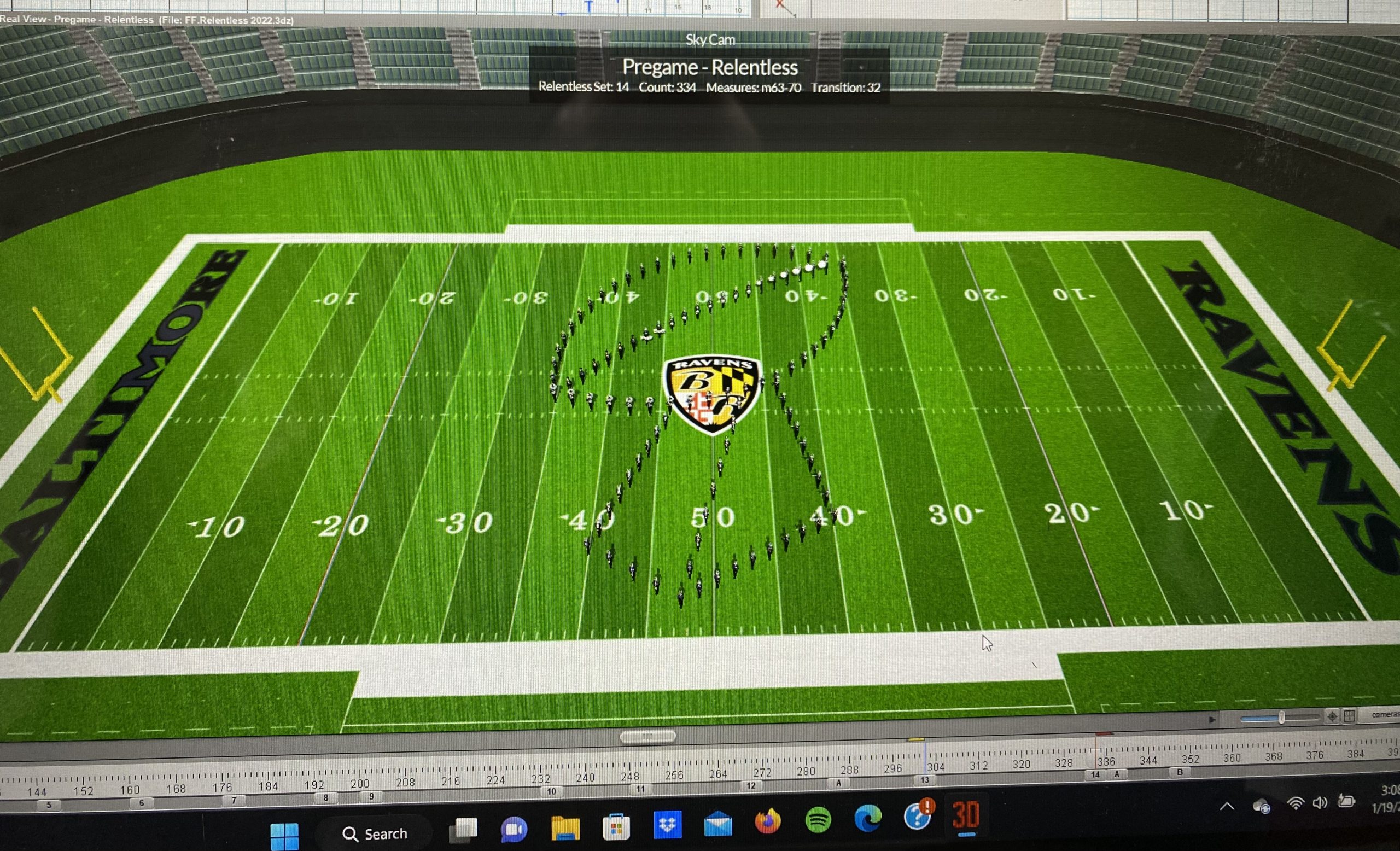 “We utilize Pyware to give our members all of the tools to prepare ahead of time. We use coordinate sheets for every member as the main source of learning drill on the field, but we also make drill charts available and 3D videos with audio so they can review what is happening visually and musically. We also give the videos and charts to the Ravens Media Team so they can plan which cameras to use for the stadium production on game day,” Westover explained.