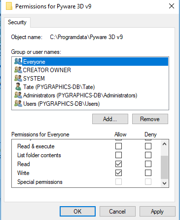 10. Back on the Security tab, select “everyone” under the Group or user names section. This will highlight “everyone” in the list. At the bottom of the window, under the “Permissions for Everyone” section, check the boxes for Read and Write under the Allow column. Press “OK”.