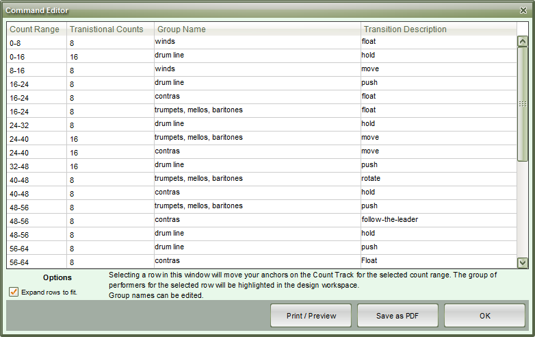 The Command Editor is a utility that allows editing of instructions (commands) for transitional maneuvers. This is particularly useful if you are teaching a military or show-style ensemble, or if you need a printed reference of visuals cues for performers.