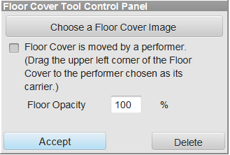 A Moveable Floor Cover is an image such as a stage, wall, or pit area. Any .jpg, .png, or .gif image can be used as the Moveable Floor Cover. All Moveable Floor Covers are entered at count 0 of the drill. Moveable Floor covers can be moved around the field by assigning a performer to be the carrier of the floor cover. To control the movement of a Moveable Floor Cover, you can assign the Moveable Floor Cover to an existing performer, or create a new performer using the Point tool. To move the Moveable Floor Cover, use any Editing tool on the performer and the Moveable Floor Cover will follow the movement of the performer.