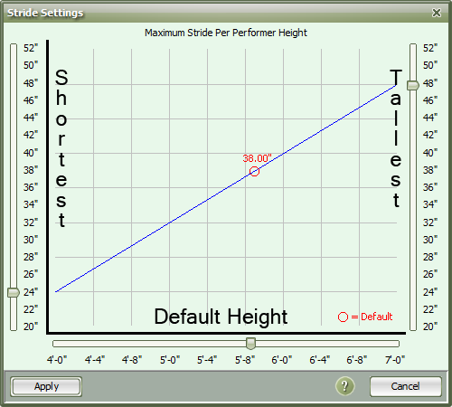 The X axis slider adjust the average height for your band. This is used as the default when height is not specified for performers in the Cast List. The default stride is indicated on the graph by a red circle on the line displaying the maximum strides for the tallest and shortest performers.
