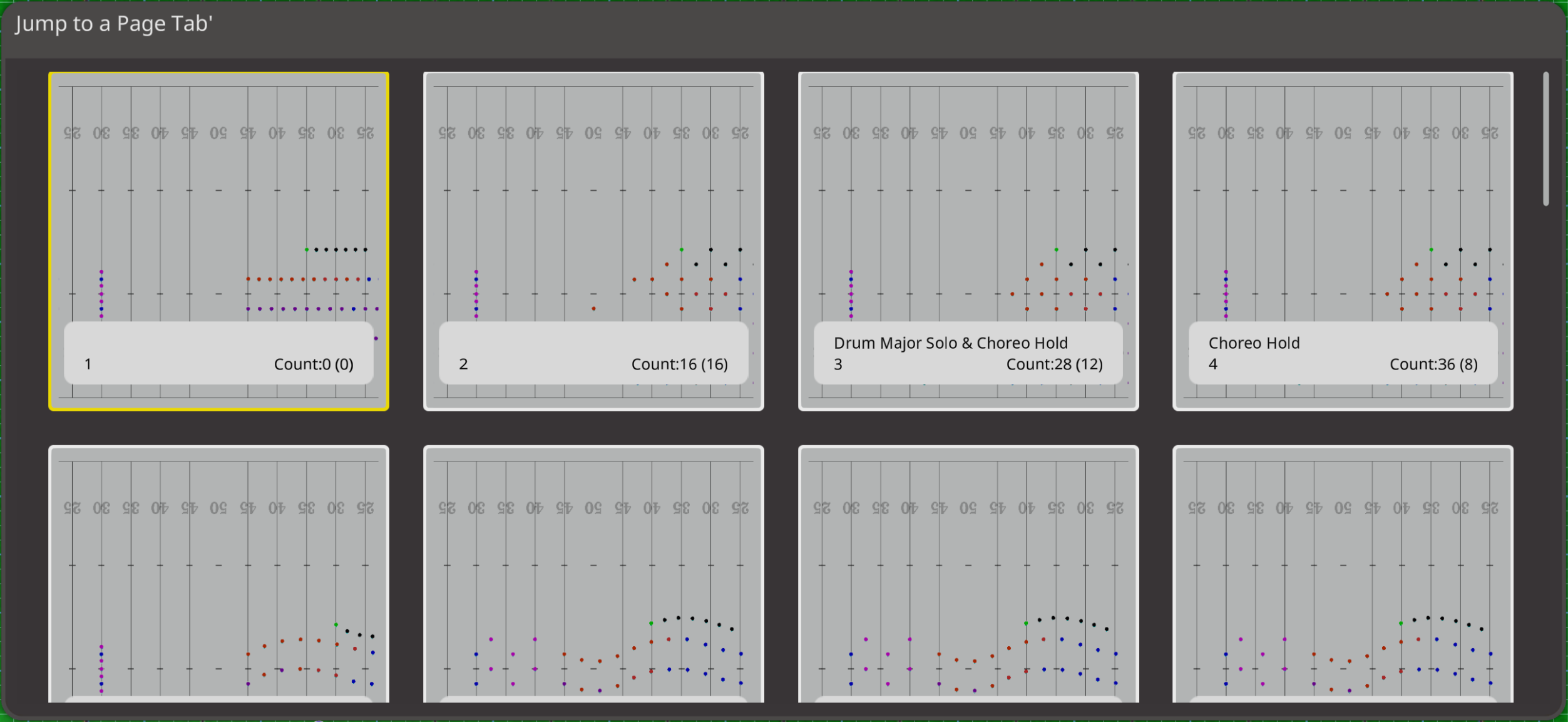This new feature provides a quick visual reference of all drill sets in sequence. Each thumbnail represents a page tab with its formation and count number clearly labeled.