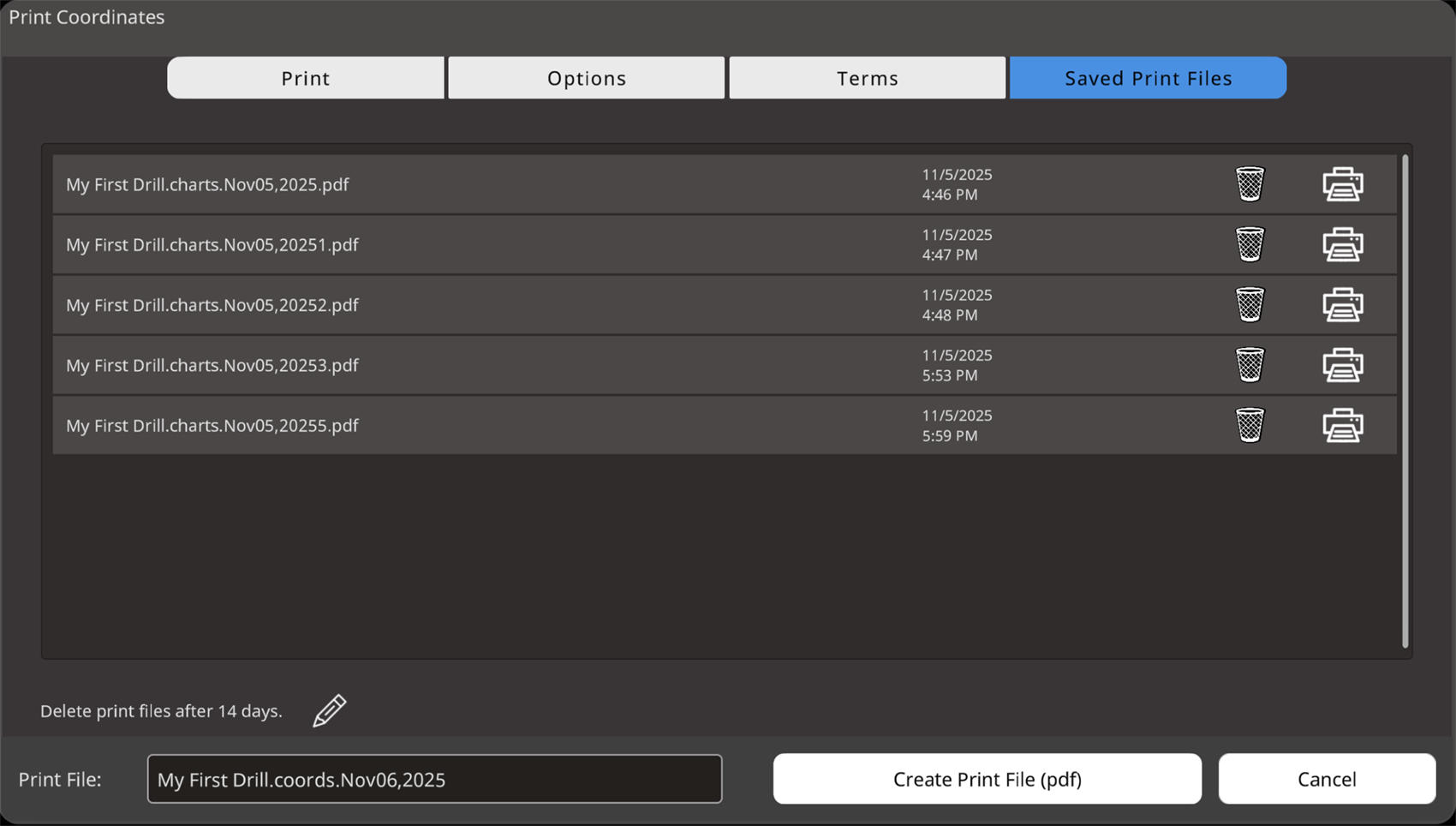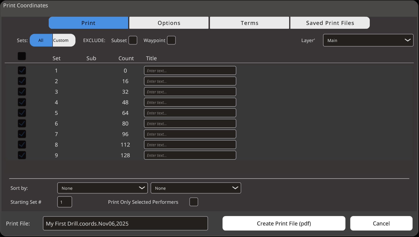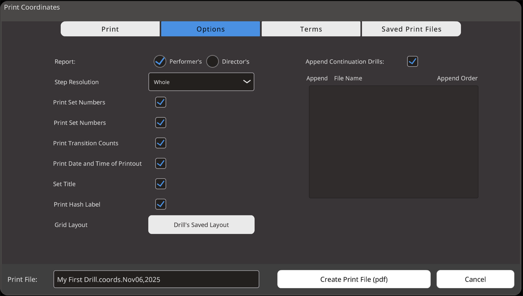 Create Print File (PDF): This creates the PDF file of the drill charts.