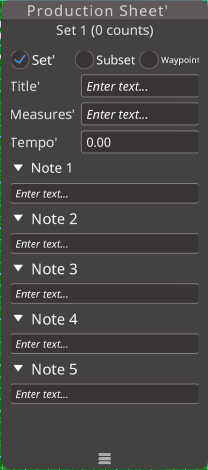 - Waypoint: This is a set that does not affect the numbering of the other sets and is used to hold a place on the count track such as a hold that happens in the middle of a transition where you do not want it numbered.