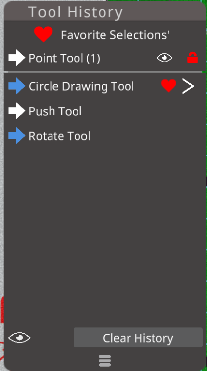 - Set History: This area will change based on what tools have been used. Hovering over the history item will highlight the performers. Clicking on the item will select the group. Clicking the Arrow will open the tool with the tool handles were last set when the tool was used on that group.