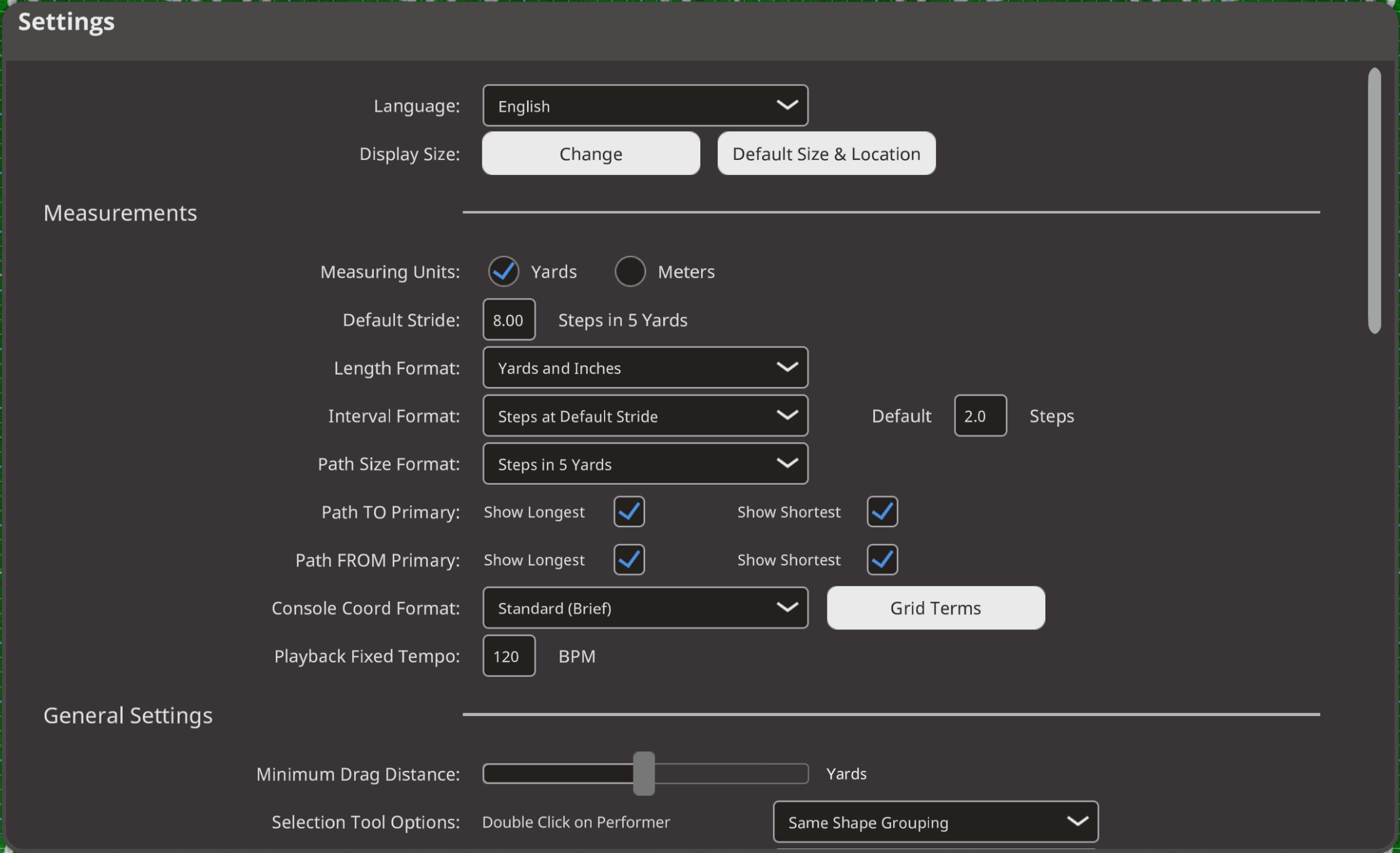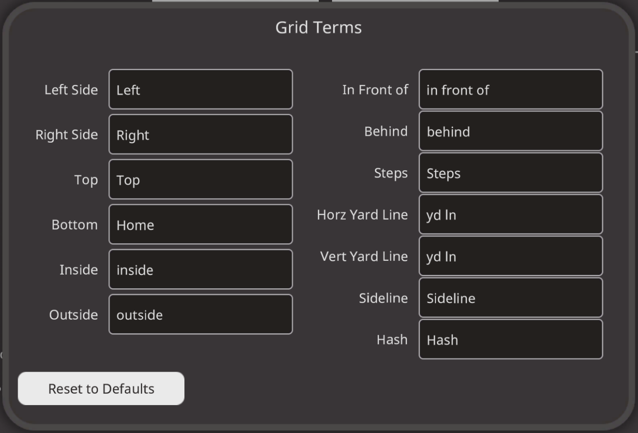 - Measuring Units: Changes the units of the grid from Yards to Meters.