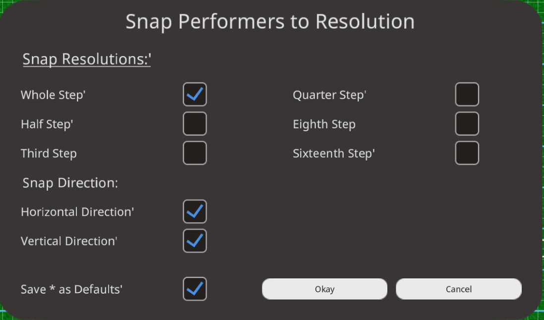 - Vertical Direction: Snap performers Vertically to the selected snap resolution.