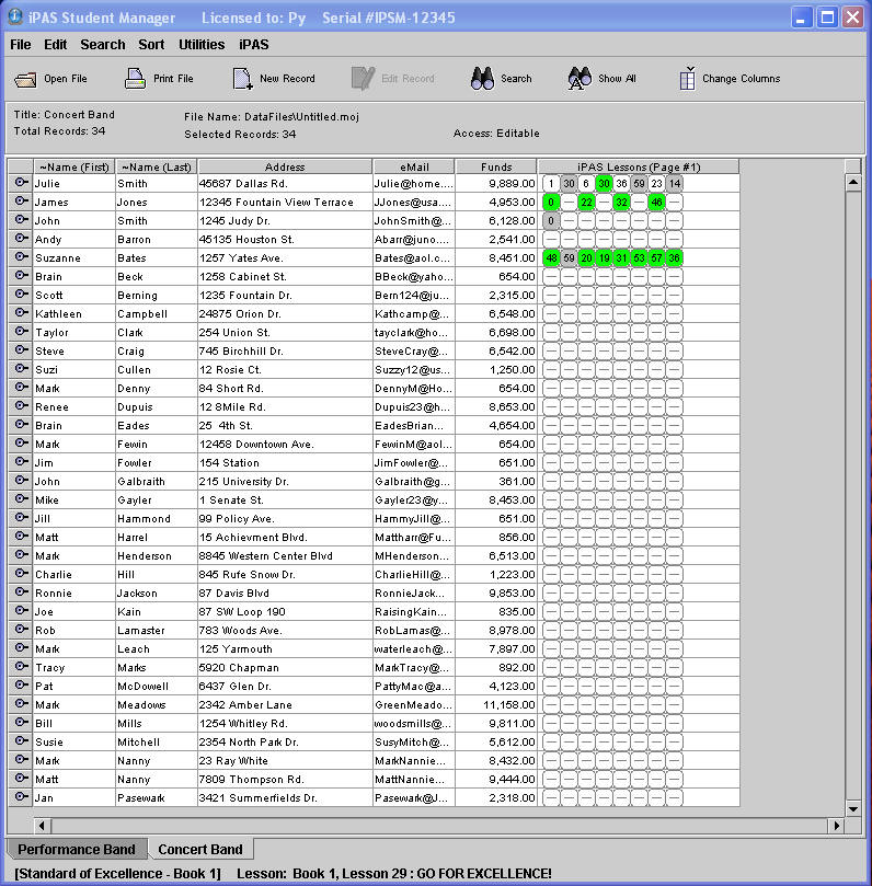 instrument, email address, and phone numbers. View student lists in a class