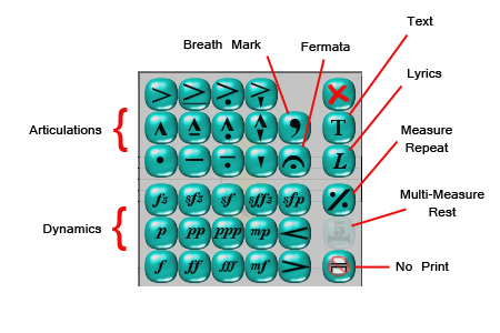 The articulations button is located on the Note Palette. Commonly used articulations are displayed on the Note Palette, directly under the show/hide articulation button. To open a larger list of articulations, select the "Note Ornaments" button on the Note Palette. This will open a sub palette with additional articulations as well as dynamics.