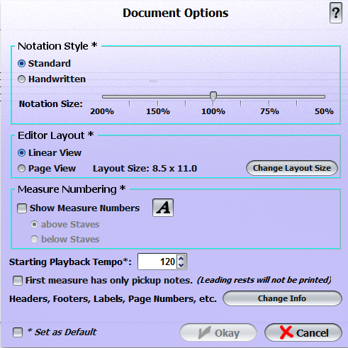 Linear View:The Linear View option will keep a continuous scroll of 1 single line per staff when viewing, editing, and playing any files. Page View:The Page View option will break lines and staves to display as pages, just like reading a book. Change Layout Size:Selecting this button allows you to change the page layout size (such as switching between Letter and Legal) as well as defining the page margins for printing. |