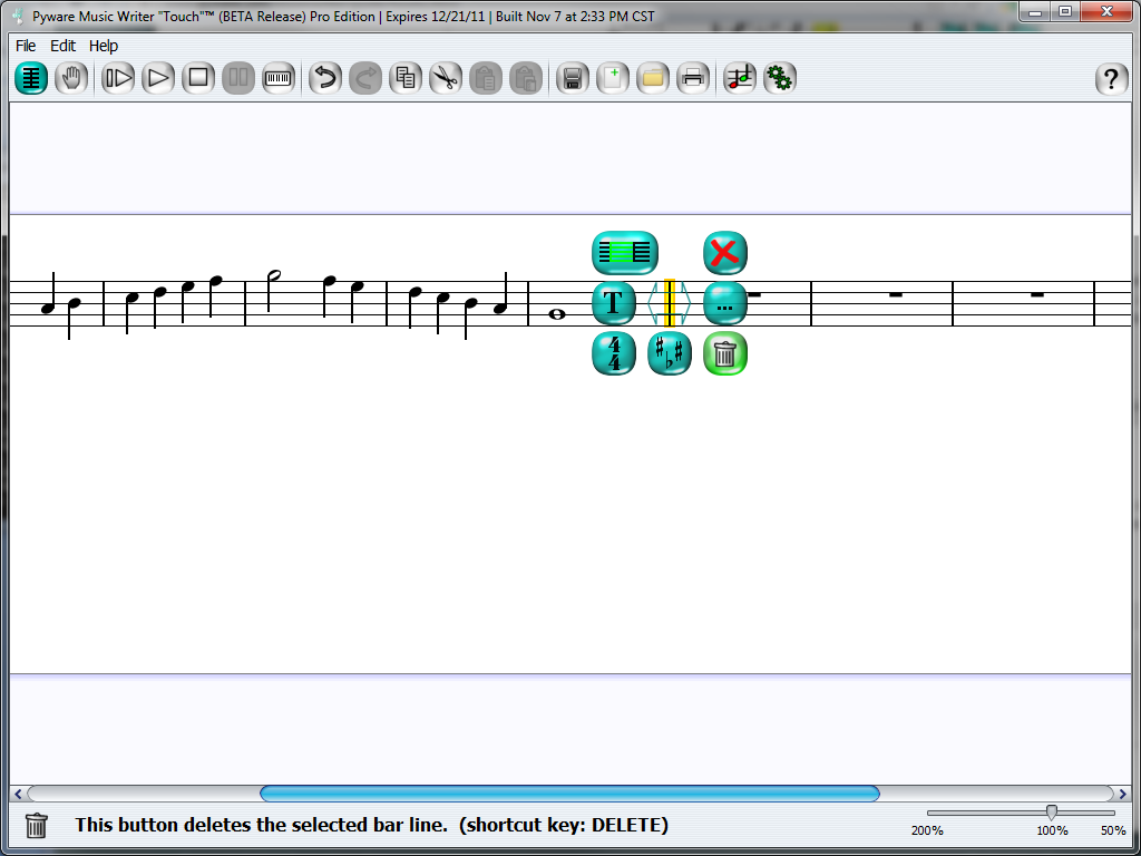 You should notice we have quite a few unused measures at the end of our file. To get rid of any unwanted measures, click on the bar-line for the measure you would like to delete. This will open the Bar-line Palette. Select the Delete button and a new window will appear, verifying the action you performed.