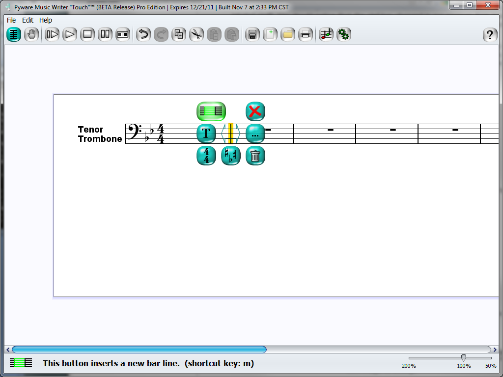 When you create a new document in Music Writer Touch, there's already a handful of measures available for immediate use. The scale study we're creating only needs 5 measures, but it would be a good idea to get a quick understanding of how to add measures to a file before continuing. Click on the first bar-line to open the Bar-line Palette.