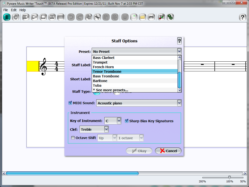 This would open the Staff Options, where we can customize the staff to our instrument. To start, let's label the staff "Tenor Trombone" by selecting it from the preset drop-down menu.