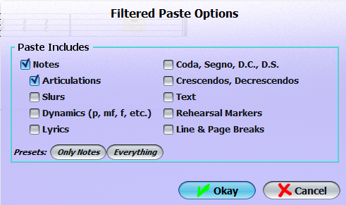 Filtered Paste allows you to set restrictions on what is to be pasted from a Copy or Cut. Copy and cut currently retrieves ALL information from the selected measure(s). This includes articulations, slurs, dynamics, lyrics, ornaments, text, rehearsal markers, line and page breaks. If you would like to exclude any or all of the above options when you are pasting your selection, Filtered Paste would be the tool for you. To Filter Paste any copied or cut notation, make sure that at least one note/rest is selected then choose "Filtered Paste." A window will open with various options on what to include or exclude for the paste. Check all options that you would like to include with the pasted notation, and leave any option you would NOT like to have pasted unchecked. Press "Okay" and your notation (with the options you have selected) will appear in your current measure.